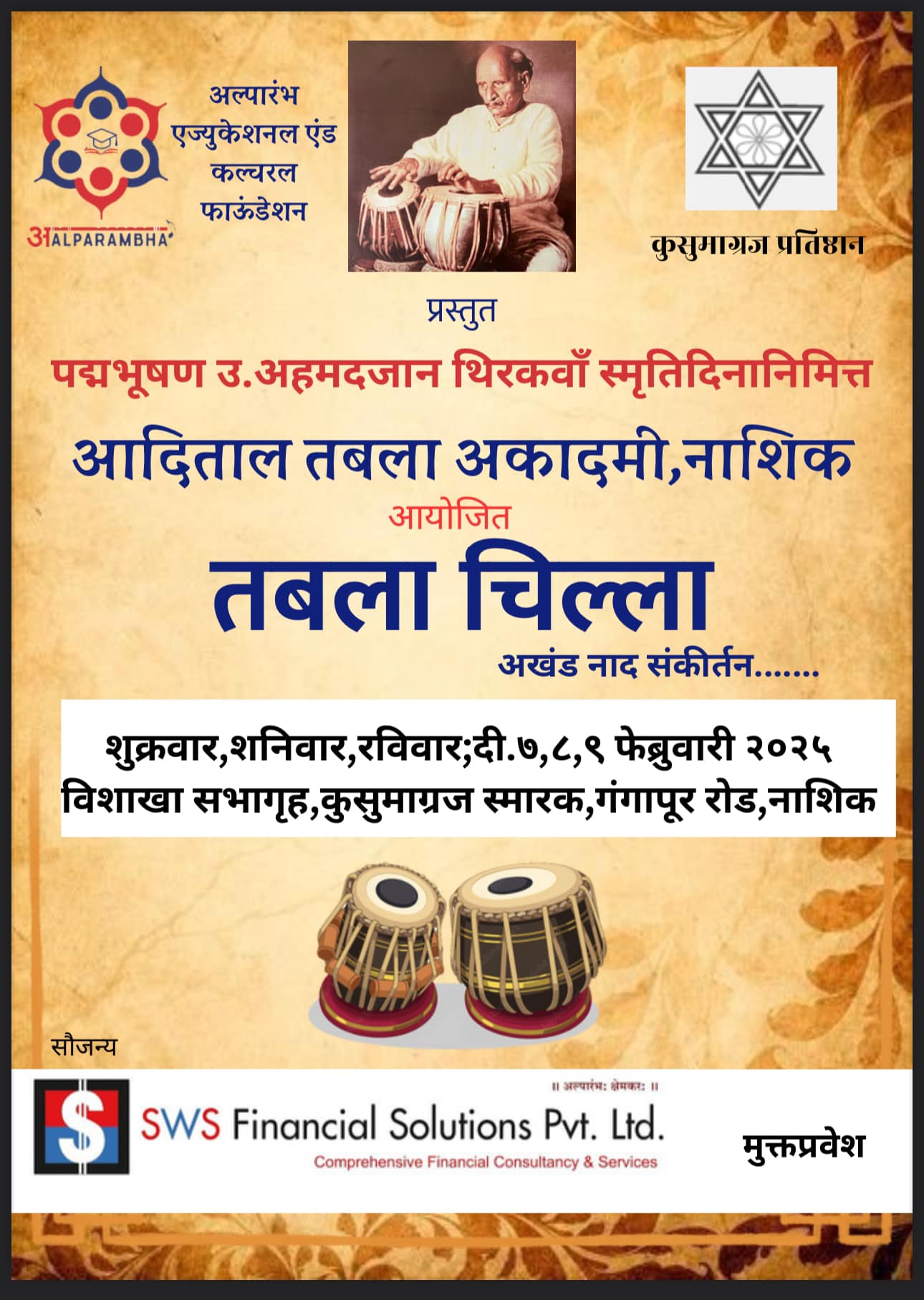 सप्टेंबर २0२४: शनिवार २९ सप्टेंबर रोजी पवार तबला अकादमी आणि अल्पारंभ एज्युकेशनल अँड कल्चरल फाऊंडेशन आयोजित "तालाभिषेक बैठक: ७" , कुसुमाग्रज स्मारक ,विशाखा सभागृहात संपन्न !!